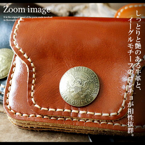 光沢と艶を出した特殊な加工を表面に施した革を使用しており、アンティークブラスのコインコンチョがアクセントになっています。