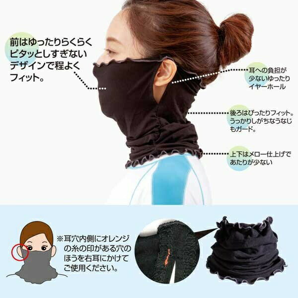ゆったりイヤーホールがあるので耳に引っ掛ければフェイスガードとしてもOK! 前はピタッとしすぎず程よくフィット、後ろはぴったりガードで背後からの紫外線もガードします。