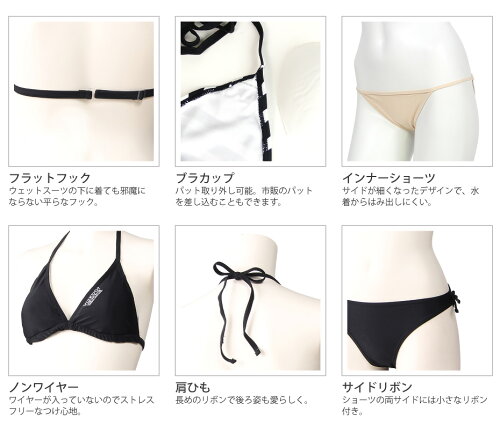 リボンやボタンなどの飾りを省いたスッキリとしたデザインなので、 ラッシュガードやウェットスーツの下に着用するのにおすすめ。