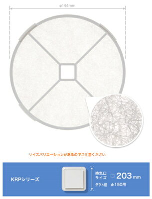 KRP150フィルターセット(5枚入り) ●換気口サイズ:□ 203mm(ダクト径:φ150) ●フィルターサイズ:φ144mm ●不織布フィルター(粗塵・花粉対策) ●捕集効率:60%(質量法/JIS 15種) ●清掃について:水洗い可 水洗いは3〜5回までとし、その後は新しいフィルターに交換してください。